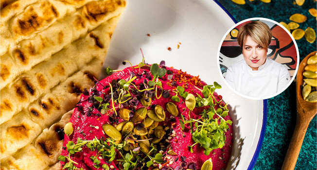 КАК ЗАМЕНИТЬ НУТ НА СВЕКЛУ И ЧТО ИЗ ЭТОГО ВЫЙДЕТ Елена Савчук работала маркетологом, но круто изменила свою жизнь, когда узнала об открытии школы Ragout. Пошла учиться на повара, одновременно стала заниматься книжным магазином при школе, а потом была работа на кухнях многих проектов — среди них рестораны «Хлеб и вино», Lavkalavka и Fresh, а также бары«Герои» и «Дипломат». Недавно Елена открыла свой собственный вегетарианский корнер Botwa на «Центральном рынке на Маросейке». В меню корнера есть карри из тыквы с рисовой лапшой, сложносочиненные вонтоны с копченым тофу, брюссельская капуста с мисо и замечательный свекольный хумус. И вот подробный рецепт этого хумуса с комментариями автора. «Это не привычный всем хумус, потому что в нем есть свекла, а нута совсем нет. Его вкус забил бы свеклу напрочь и сделал бы блюдо слишком плотным. Еще одно отличие вот в чем: в обычном хумусе используется тхина, паста из семян кунжута. Я же добавляю в нее еще и подсолнуховые семечки. Во-первых, это