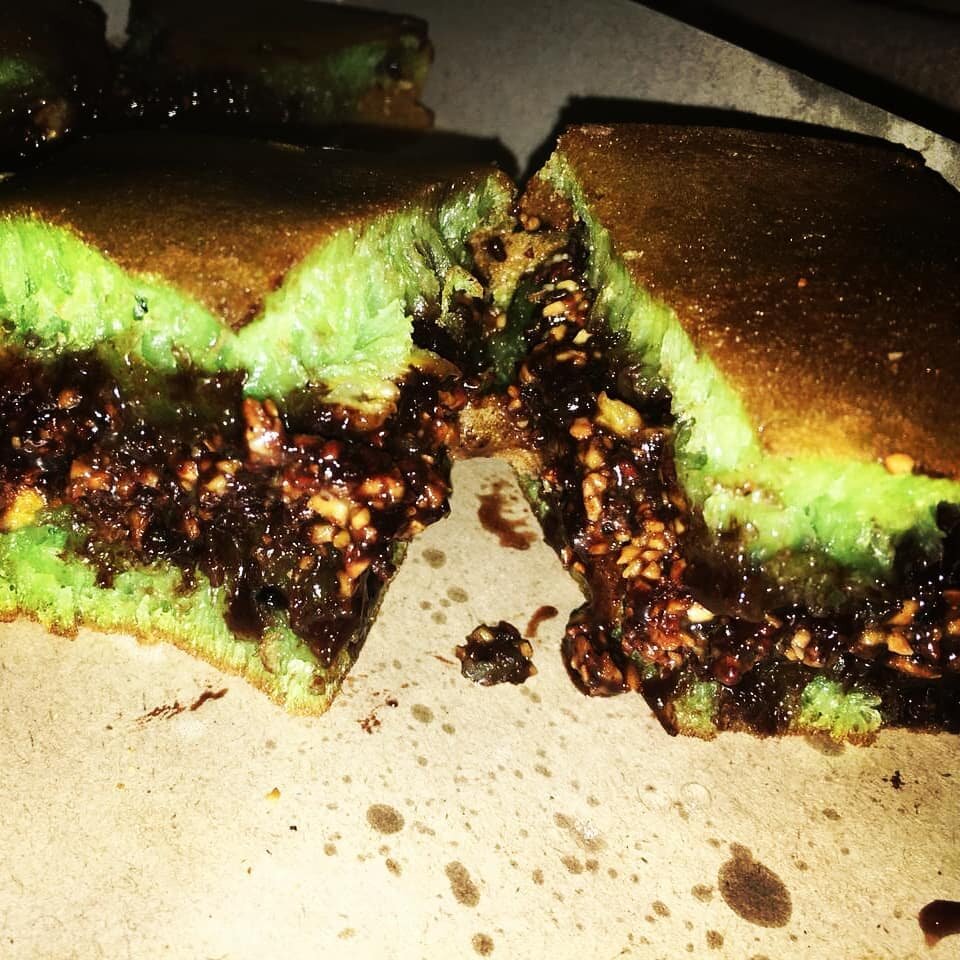 Сегодня у нас на десерт был каканг писанг сусу 😂 Пирог из традиционного балийского теста с начинками. Вообще сам пирог называется теранг булан, а смешным названием он обязан начинкам - каканг (орех), писанг (банан) и сусу (сгущенка)🤗. Можно еще добавить шоколад и сыр. Прощай ПП. Стоит это удовольствие 18 рупасов (80р) и хватает его на двоих наесться до отвала. На Бали многие вкусняшки делают из зеленого теста из рисовой муки и кокосового молока. Зеленый цвет получается из-за добавления экстракта азиатских растений - суджи и пандана.☝️🧐