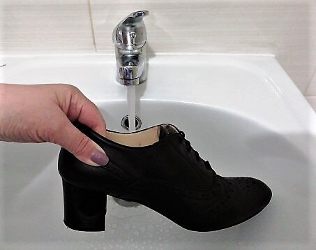 Берем туфли, наливаем горячей воды, ждём 2-3 минут, чтобы натуральная кожа хорошенько разогрелась (если вода быстро остывает, налить повторно); выливаем воду.