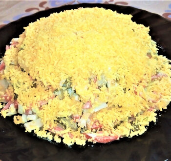 Готовый салат выкладываем горкой на блюдо и посыпать тертым на мелкой терке желтком.