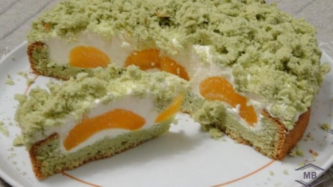 В ожидании, когда всё вокруг зазеленеет, мне захотелось приблизить приход весны. А торт с нежным названием «Весенняя норка крота» — как раз тот самый случай! Ингредиенты: Для бисквита (форма 26 см): 200 грамм муки (можно 180 г муки и 20 г крахмала), 180 грамм сахара, 4 крупных яйца, 70 мл воды подкрашенной шпинатом (50 г листьев шпината) или пищевой краситель, 5 грамм разрыхлителя, 1 чайная ложка ванильного сахара, щепотка соли. Для крема и наполнения: 250 грамм фруктового (персикового) йогурта, 500 мл сливок 33-35%, 100 грамм сахарной пудры, 10 грамм желатина, 70 мл воды/молока/сиропа, 1 банка (820 грамм) консервированных персиков, 100 грамм белого шоколада. Процесс приготовления: Если у Вас нет пищевого красителя для придания бисквите нежного зелёного цвета, то можно приготовить подкрашенную водичку с помощью шпината. Свежий шпинат нужно залить кипятком и дать настояться около 10 минут. Затем со шпината слить воду, а листья шпината отправить в блендер с 50 мл воды. Готовую массу про
