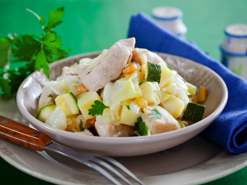 Изюм промыть и замочить в теплой кипяченой воде на 15 мин. Куриное филе вымыть и нарезать кусками шириной 3 см. Цукини нарезать кубиками. Капусту нарезать крупными квадратами. Картофель и лук очистить и нарезать кубиками. Петрушку вымыть, обсушить и мелко нарезать. Чеснок очистить и измельчить. Шаг 3