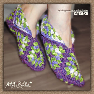 Источник Дата проекта: декабрь 2017 Техника: вязание крючком мотивами Размер: 37-38 Материалы: остатки пряжи, 100% хлопок цвет: зеленый, сиреневый разных оттенков Крючок №: 2,5 Рекомендации по уходу: ручная стирка Мастер класс: domihobby.ru Источник описания модели: интернет Симпатичные разноцветные следки состоят из квадратов связанных крючком по классической схеме вязания «бабушкиного» квадрата. Вязаные следки очень удобны, их можно носить вместо домашних тапочек. Схема вязания «бабушкиного» квадрата очень простая, а сшить следок из связанных квадратов не составит труда. Для одного следка необходимо связать 8 квадратов – 4 обычных «бабушкиных» квадрата по схеме и 4 квадрата вяжите с одним скругленным углом. Ширина связанного квадрата должна быть 9 см для получения следков на 39-й размер ноги. Квадрат состоит из 6-ти рядов провязанных группами из 3-х ст с/н по сторонам, а по углам вяжется 2 группы из 3-х ст с/н, разделенных одной воздушной петлей. Седьмой, заключительный ряд квадрат