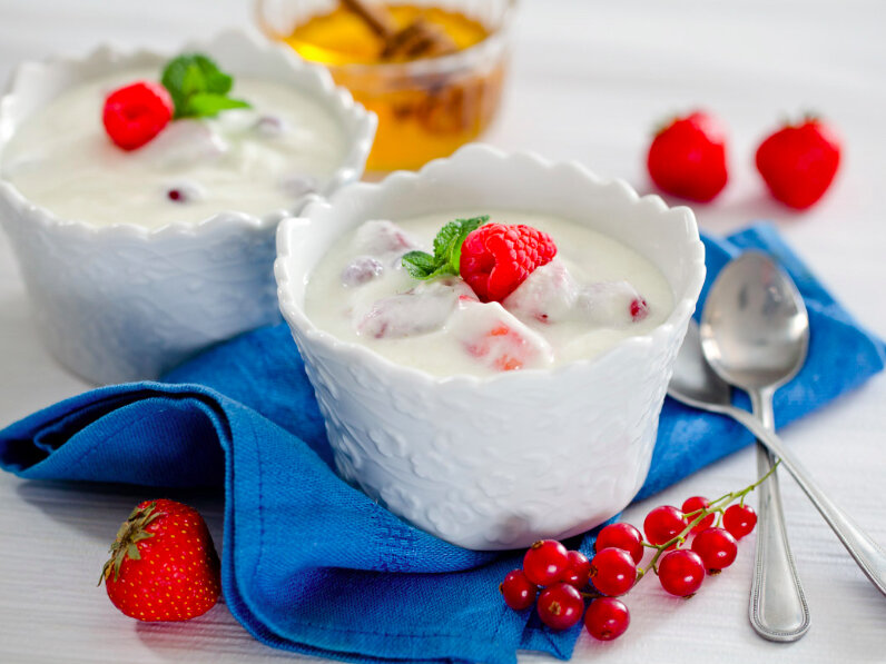 Включить режим «Йогурт», закрыть крышку и готовить 6 часов. Проверить йогурт на готовность. Он должен быть плотным. Если йогурт еще жидкий, готовить его в том же режиме еще 1 час. Тем временем ягоды вымыть, обсушить. Клубнику крупно нарезать, смородину снять с веточек, малину оставить как есть. Шаг 5