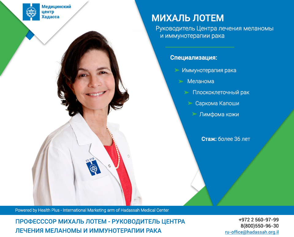 Профессор Михаль Лотем - руководитель Центра диагностики и лечения меланомы и иммунотерапии рака в “Хадассе”, является признанным экспертом в лечении злокачественных новообразований кожи. В прошлом году профессор возглавила еще одну новую лабораторию по исследованию иммунотерапии в ведущей клинике Израиля. Под ее руководством была разработана вакцина от меланомы, позволяющая добиться стойкой ремиссии и минимизировать вероятность рецидива болезни. Исследовательская деятельность профессора была отмечена престижным грантом от сообщества ученых по изучению меланомы (Melanoma Research Alliance — МRА).