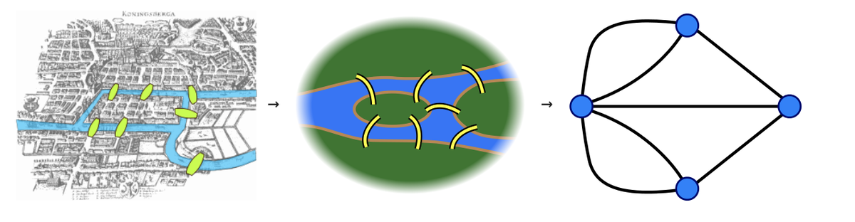Среди жителей Кёнигсберга (нынешний Калиниград) была распространена такая загадка: как пройти по всем городским мостам через реку, не проходя ни по одному из них дважды. Многие пытались решить эту задачу как теоретически, так и практически, во время прогулок. Впрочем, доказать или опровергнуть возможность существования такого маршрута никто не мог.