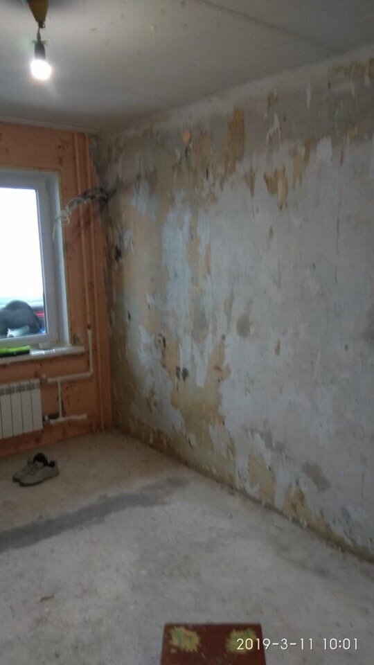 Трудности начались при демонтаже, на фото видно, что обои отходят очень плохо, кроме того они были поклеены в неск