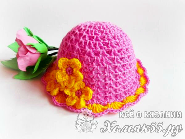 Для работы вам понадобится акриловая, льняная или хлопковая пряжа двух цветов: розовая для самой шапочки и ярко-желтая для украшения. Связать такую вещичку вы сможете с помощью крючка № 2.