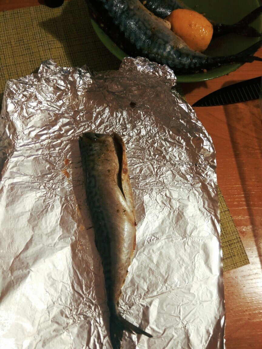 Скумбрия в фольге. Чистим скумбрию от внутренних органов и отрезаем ей голову. Маринуем рыбу в соке лимона, соевом соусе и приправе для рыбы. У меня в холодильнике в маринаде она пролежала больше 12-ти часов , а так хватит часа 3. Наливаем в противень немного воды (2 миллиметра) . Фольгу смазываем каплей подсолнечного масла и заворачиваем в нее скумбрию. Отправляем в разогретую до 180 градусов духовку на 35 минут. Очень вкусно) идеальный гарнир- картофельное пюре со сливочным маслом и зеленью...