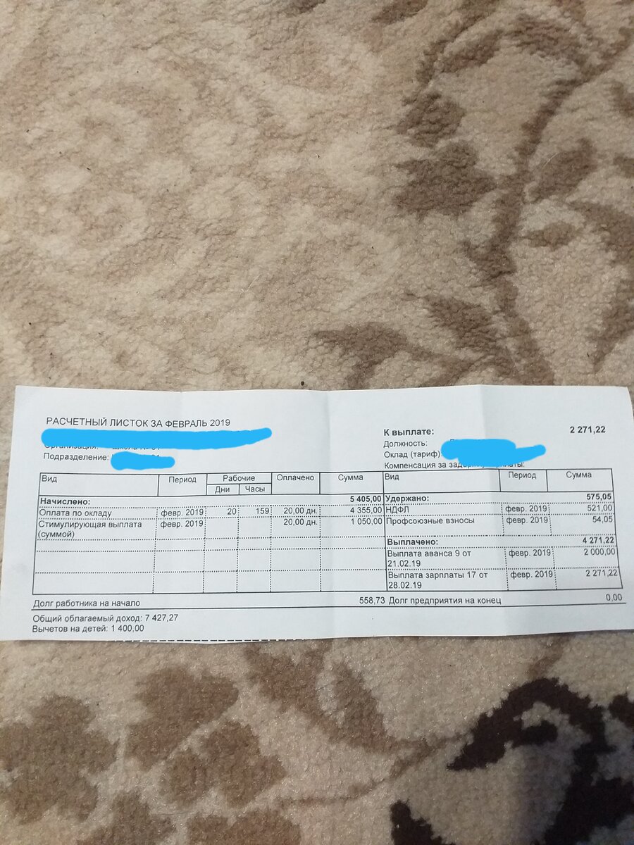 Здравствуйте дорогие друзья! Как и обещал пишу о зарплате моей жены, учителя математики, в одной из школ нашего города. Сегодня взяли расчетный листок за февраль 2019 года. И о чудо! Если в прошлом месяце, на была должна школе 558 рублей, вы можете увидеть это на фото в графе долг работника на начало месяца, то в этом месяце ей даже заплатили!!! Правда это сложно назвать зарплатой, даже для глубинки российской. Но давайте посмотрим и разберемся детально. В феврале месяце она отработала 20 дней...итого 159 часов!!!запомните эти цифры! Оплата по окладу 4355 рублей+ стимулирующая выплата 1050 рублей!!! Как вам? Стимулирует? Чувствуете как сразу захотелось выложиться на все сто? Общая сумма 5405 рублей! Так давайте ж посчитаем, сколько в день... 5405÷20=270 рублй в день!!! Огромные деньги...можно купить молока, хлеба, котлеток и например рис или гречку! Такое чувство что платят так, чтоб с голода не померли просто. Я просто не понимаю, а как вообще можно прожить на такую зарплату, если н