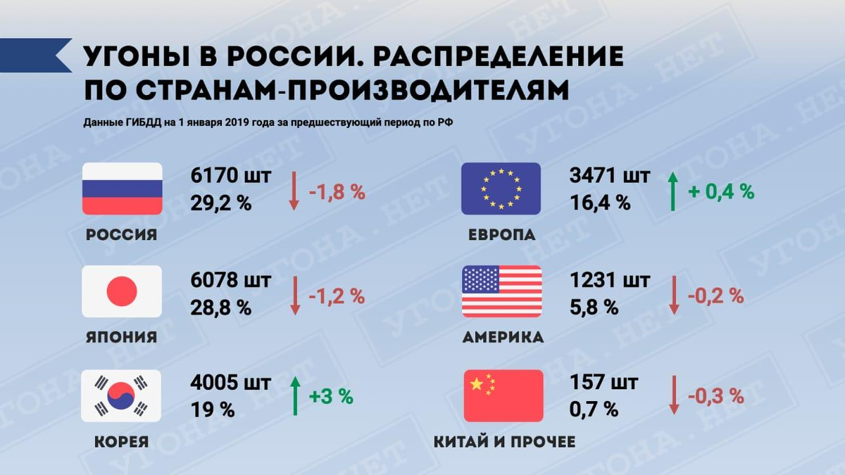 По данным ГИБДД за 2018 год количество угонов легкового транспорта в России сократилось на 20% по сравнению с предшествующим периодом. В этом сезоне мы видим легкое перераспределение хищений автомобилей среди стран-производителей, Корейцы поднялись на 3 пункта вверх и судя по всему этот тренд сохранится. Среди угнанных марок автомобилей ситуация почти не меняется много лет, первое место занимает бренд Лада. Угоняют бренд Лада чаще из-за простого обхода заводской системы охраны, а дополнительные охранные системы бюджетного класса, которые ставят владельцы, поддаются простым методам нейтрализации. Среди моделей первая тройка также осталась неизменной — это Hyundai Solaris (1 265 машин), Kia Rio (976) и Toyota Camry. При этом эксперты предупреждают: новые «Тойоты» 2018 модельного года похитить стало проще — ко всем ранее существующим методам добавилось вскрытие через CAN-шину и запуск двигателя при помощи аварийного кода. Источник: pdd-now.ru