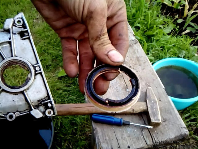 Для начала, заменим сальник коленчатого вала в передней крышке - за годы работы резина задубела и начало выдавливать масло.