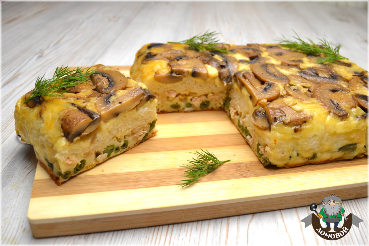 3) Пирог выпекается в духовке в глубокой форме. Форму выстилаем бумагой для запекания. Слоями выкладываем начинку в таком порядке: грибы, сыр, рис, филе, фасоль. Равномерно заливаем тестом и отправляем в духовку, разогретую до 175℃ на 40 минут. Готовый пирог оставить в форме остывать на 20-30 минут и после перевернуть на блюдо.