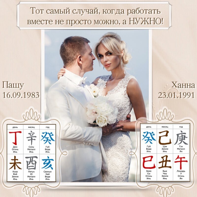 Посмотрите какая интересная пара! У Ханны в столпе месяца, который отвечает за работу и деятельность, стоит только стихия мужа. Причём стихия в её экстремальном проявлении (7 убийц) как в земных так и в небесных стволах. По карте рождения Ханны её муж связан с ее профессией и работой, и приносит ей популярность (которая, кстати, у Пашу встроена в карту) А у Пашу в месяце стоит только стихия жены и тоже в ее экстремальном проявлении, и тоже в земных и небесных столпах. О чем это говорит? Ну конечно! Жена, связана с работой и приносит в его жизнь большие деньги. Просто прелесть, а не пара! Хотелось бы знать их время рождения. Очень похоже, что у Ханны структура карты – следование за мужем, а у Пашу – следование за женой и деньгами. Одно ясно – встретились они не случайно, совместимость очень интересная. Если допустить, что у Пашу структура следования, то ему очень полезна стихия земли в карте Ханны, она даёт ему энергию, чтобы действовать и творческое вдохновение. Просто поразитель