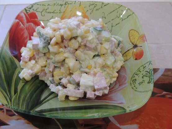 Салат из кукурузы, колбасы и яйца готов. Наслаждайтесь вкусом. Приятного аппетита.