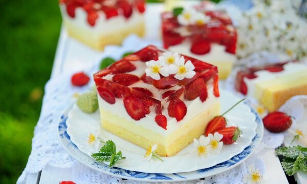Если вы ищете не пробовали этот вкусный пирог с клубникой, то настоятельно рекомендую попробовать. Клубника в сочетании с освежающей сливочно-желейной массой и мягким бисквитом - лучшее сочетание. Сливочно-Клубничный Пирог "Весна" Нам понадобится: Бисквит: - 4 яйца, - 4 столовые ложки сахара, - 4 столовые ложки муки, - Щепотка порошка для выпечки,(разрыхлитель) - Щепотка соли Крем лимонный: - 2 крема-абрикосовое, - 0,5 стакана сахара, - Сок из 3 лимонов ( около 0,5 стакана выходит), - 3 желтка, - 1 столовая ложка муки картофельной,(крахмал) - 0,5 столовые ложки муки, - 1 ванильный сахар, - 220 грамм сливочного масла Сливочная масса: -500 мл сливок 30 %, -1 столовая ложка сахарной пудры, -4 чайные ложки желатина, -1/3 стакана воды Дополнительно: -600 грамм клубники, -2 желе виноградных. Процесс приготовления: Бисквит: 1. Белки с солью взбиваем до жесткой пены. Добавляем постепенно сахар. 2. Когда ингредиенты будут тщательно перемешаны, добавляем желтки. 3. В пушистую яичную массу п