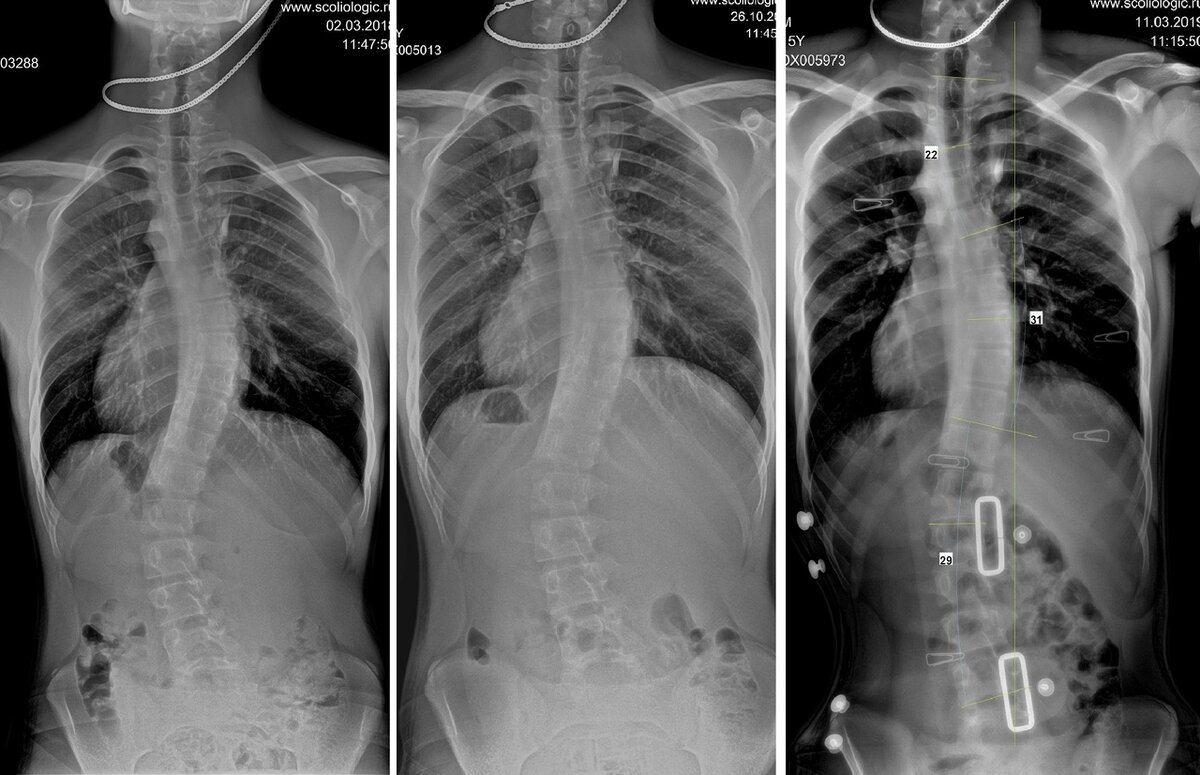 Пациент попал в Сколиолоджик.ру в марте 2018 года в 14 лет - родители предприняли последнюю попытку избежать операцию, которую уже назначили. Градусы - 52-51-41.