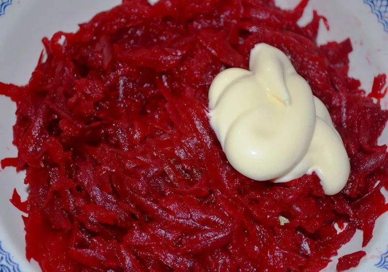 3. Взять необходимое количество свеклы, заправить майонезом, а остальную - сложить в герметичный судок и хранить в холодильнике. Отварная свекла с майонезом готова.