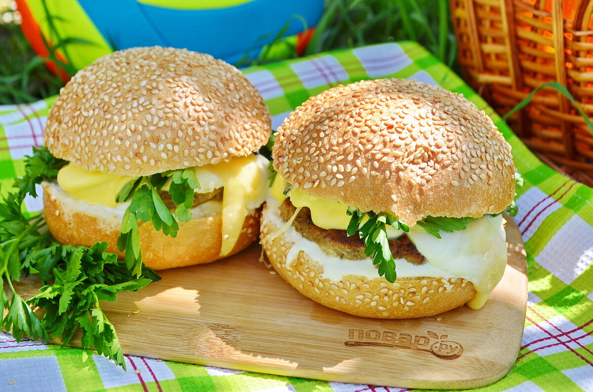 На ужин или вечеринку с друзьями приготовьте сытное горячее –настоящий бургер с хрустящей булочкой, свежими овощами, сочным мясом или рыбой. Подавайте с картошкой-фри. Объедение! Чизбургер или бургер с сыром В нашем бургере – три вида сыра и свежий огурец. Котлеты приготовим из рубленой говядины. Продукты для двух бургеров: 1. Подготовьте продукты для бургеров (булочки должны быть свежие). 2. Говядину порежьте полосками, затем мелкими кубиками. Отбейте фарш, с силой бросая его в миску или на стол. Затем сформируйте две котлеты и поджарьте с двух сторон на раскаленной сковороде, смазанной сливочной маслом, не более 10 минут. Порежьте ломтиками огурчик и моцареллу. 3. Каждую булочку для бургера прогрейте на сковороде-гриль, затем порежьте вдоль, смажьте плавленым сыром, он не течет и не впитывается, это позволить сохранить булочки целыми и плотными. 4. Положите на сыр котлеты, смажьте любимым соусом (дижонской горчицей) или майонезом, затем моцареллу, твердый сыр, ломтики огурца. Можно д