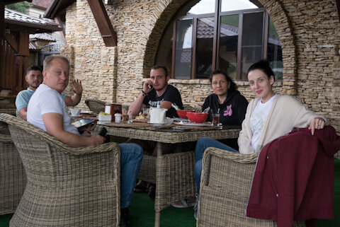 Поездка до Кисловодска ничем примечательным не отличалась. Ехали в два руля. Маршрутка позволяет комфортно спать в поездке. Больше 100 не гнали. Большие колёса и размеры маршрутки вовсе не располагают ставить рекорды скорости. Опять же, ни одного штрафа за поездку. Пара Дискарей, куда то заезжали, где то останавливались, закупались продуктами на всю компанию, обгоняли нас пару раз. В общем, сдулись под Ростовом и пошли спать в отель. Мы же, встали на ночь под Кисловодском. Отравив свой местоположение. Встретились утром, выспавшиеся и полные сил для грядущих приключений. Естественно, завтрак — это святое.