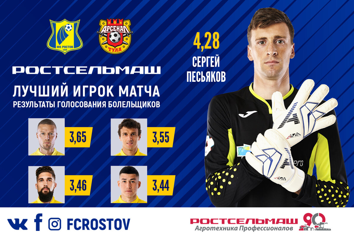 По итогам встречи против "Арсенала" таковым стал Сергей Песьяков, отразивший несколько опасных ударов по ходу игры. Средний балл который отдали болельщики Сергею составил 4.28.