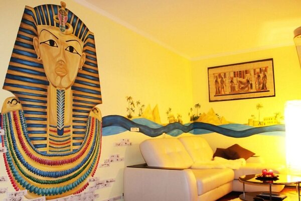 В египетском стиле очень много жёлтого цвета и всех его оттенков. Яркие цвета допускаются в этом стиле, но используются в минимальном количестве. В Египте много домов, где стены белого цвета, а вот потолки, как и в марокканском стиле синие. Но не стоит чрезмерно увлекаться, египетским стилем и ставить в дом гробницы, ведь в такой квартире вы будете чувствовать себя не комфортно.