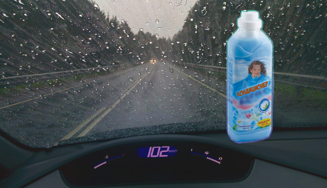 Концентрация такой смеси нигде толком не уточняется – большинство писало, что льют колпачок кондиционера в полный бак омывайки. Так сделал и я. В сухую погоду сотворил такую смесь и начал ждать дождливой погоды.