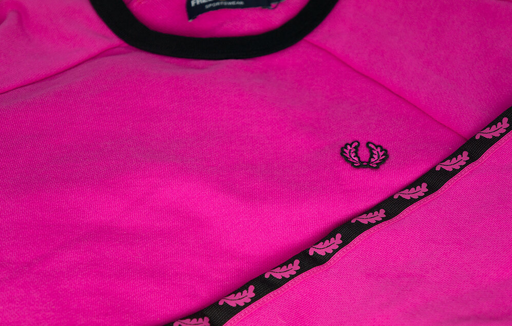 В наших обзорах мы будем рассказывать не только про мужские, но и женские вещи, которые мы до сих пор незаслуженно обделяли своим вниманием. Для нашего обзора мы взяли свитшот из линейки Fred Perry Sportswear. ТКАНЬ Свитшот сделан из плотного хлопчатобумажного футера-трехнитки, который достаточно неплохо тянется. С изнанки ткань имеет крупное ребристое плетение, а с лицевой стороны она абсолютно гладкая. Плетение на лицевой стороне мелкое, со стандартным рисунком. ЛОГОТИП На этой модели не традиционный лавровый венок, а венок из дубовых листьев, встречающийся только на некоторых моделях. Этот венок гораздо крупнее лаврового. На каждой веточке 9 листочков, в центре венка между двумя веточками – узелок. Венок не вышит непосредственно на толстовке, а сделан в виде нашивки. Принт венка также украшает лампасы на рукавах. БИРКИ Бирка на спине изделия под бейкой, которой обработана горловина, пришита с правой и с левой стороны. Справа к ней крепится маленькая бирка с размером. Размер обознача
