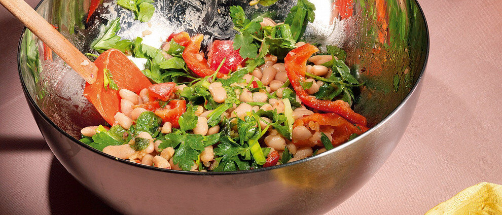 3.Лук и прочие пряные травы крупно нарубить и перемешать с фасолью и соусом. Посолить и поперчить, если вам недостаточно соли в соевом соусе и перца — в сладком чили-соусе.