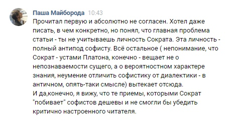 В-третьих, в тех кусках что я приводил, Сократ не «побивает софистов», как ты говоришь. Он общается с обычными гражданами. Софистов же он, как и Платон, вообще почти никак не побивает, кроме простого «ну они деньги берут, а это плохо, это тоже самое что покупать дружбу за деньги».