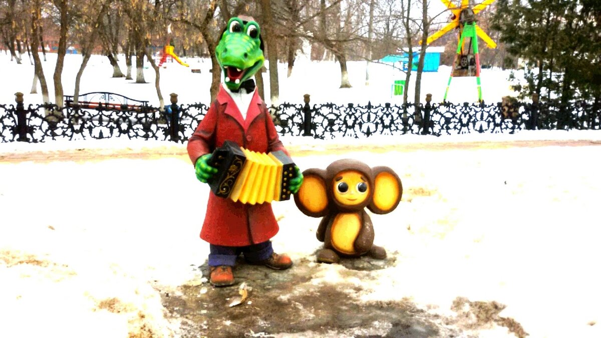 Есть в нашей Липецкой области один небольшой городок с названием Чаплыгин. И чем мне этот город больше всего запомнился, это различными героями мультфильмов, стоящими на одной из улиц. Вот прямо совсем недалеко от парка стоят Чебурашка с крокодилом Геной и охотно предлагают прохожим сфоткаться с ними. И многие к ним подходят, делают селфи на память. Проходим чуть подальше по тротуарам, и видим Волка и Зайца из "Ну, погоди!". Я прекрасно помню этот момент из мультфильма, когда они прогуливались по палубе корабля, и Заяц наступил на штанину Волку, после чего она оторвалась. Теперь вот, герои этого мультика гуляют по Чаплыгину. А вот сова, сидящая на домике. Не знаю, из какого она мультфильма, но наверняка в каком-то тоже есть. А здесь мы видим почтальона Печкина с котом Матроскиным. Ну конечно же, все помнят этот мультик и фразу: -Кто там? -Это я, почтальон Печкин, принес журнал "Мурзилка"! А теперь немного прогуляемся по парку. Заходим в парк и видим Короля Льва со львицей. Правда они н