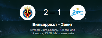 Сегодня состоялся ответный матча в котором Зенит в гостях уступил Вильяреалу со счётом 2:1. В первом тайме Зенит имел как минимум 2 возможности забить гол. Однако удача была на стороне Вильяреала. Однако футболисты Вильяреала при первой возможности смогли открыть счёт в матче. В начале второго тайма Вильяреал удвоил преимущество. Зенит в конце матча смог забить гол. Голы: Морено 25' , Бакка 47' , Иванович 90+1'(Зенит) В первом матче Зенит уступил в Санкт-Петербурге Вильяреалу со счётом 1:3. По сумме двух матчей победу одержали футболисты Вильяреала 5:2.