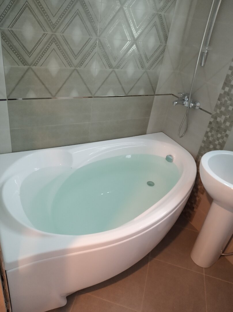 Первое что бросается в глаза, это угловая ванна, и это понятно, стандартные планировки не позволяют разместить ванну таких размеров, что бы можно было в ней растянуться, и тут на помощь приходят угловые варианты, которые позволяют чуть удлинить полезное пространство.