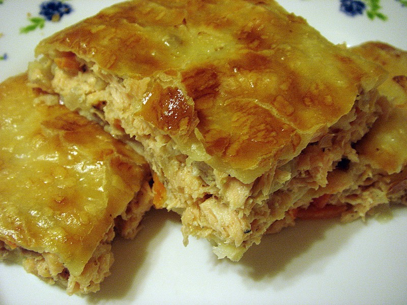 10. Разогреваем духовку до 190 градусов С и выпекаем в ней наш пирог из слоеного теста с курицей около 20 – 25 минут.