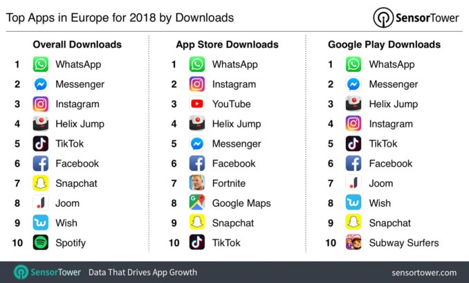 Компания Sensor Tower периодически публикует интересные аналитические обзоры о рынке приложений в разрезе категорий и стран. Не так давно они пролили свет на положение дел в Европе. О самых скачиваемых и зарабатывающих приложениях читайте в нашей статье. Самые скачиваемые приложения в Европе в 2018 году Топ приложений в Европе оккупирован мессенджерами. На первом месте несменяемый WhatsApp, который лидирует на двух платформах. Он за год получил более 161 миллиона новых установок. На втором месте также принадлежащий Facebook Messenger и также внушительное число скачиваний — 118 миллионов. На третьем месте еще один продукт Facebook — социальная сеть Instagram. Четвертое место у гиперказуальной игры Helix Jump. Пятое — запущенная в 2018 году социальная сеть TikTok, набравшая большую популярность в последние месяцы. Шестое место у самого Facebook и седьмое у еще одной социальной сети — Snapchat. Определенно, Марку Цукербергу стоило купить Snapchat за любые деньги, когда еще была такая воз