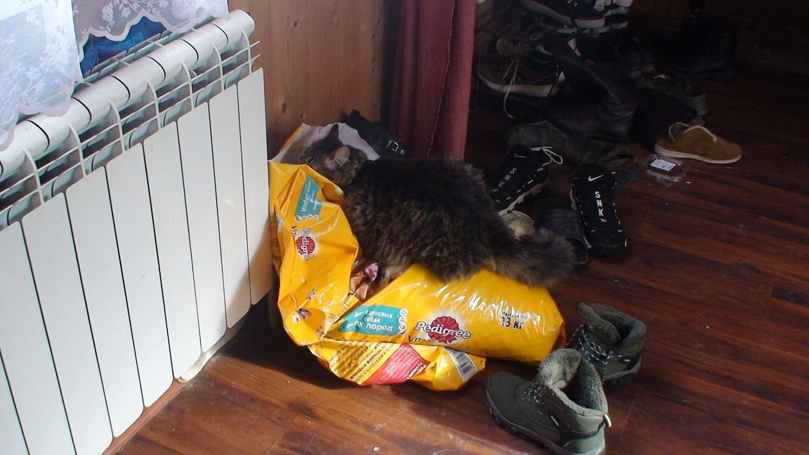Застукала своих кошадей за визитом в пакет с собачьим кормом. Сначала в пакет залез младший кот. Потом старшая кошадь заинтересовалась хрустом и подошла посмотреть, чем это он там хрустит? Но тут они наконец-то заметили меня, поняли, что спалились и удрали. Вот так вот, глаз да глаз!