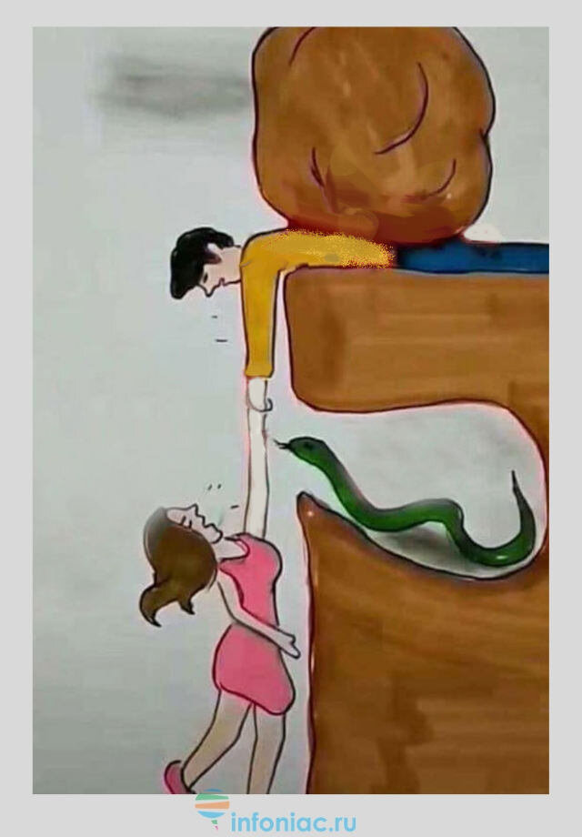 Мужчина не знает о том, что внизу находится змея. Женщина не знает о том, что мужчину придавил камень.