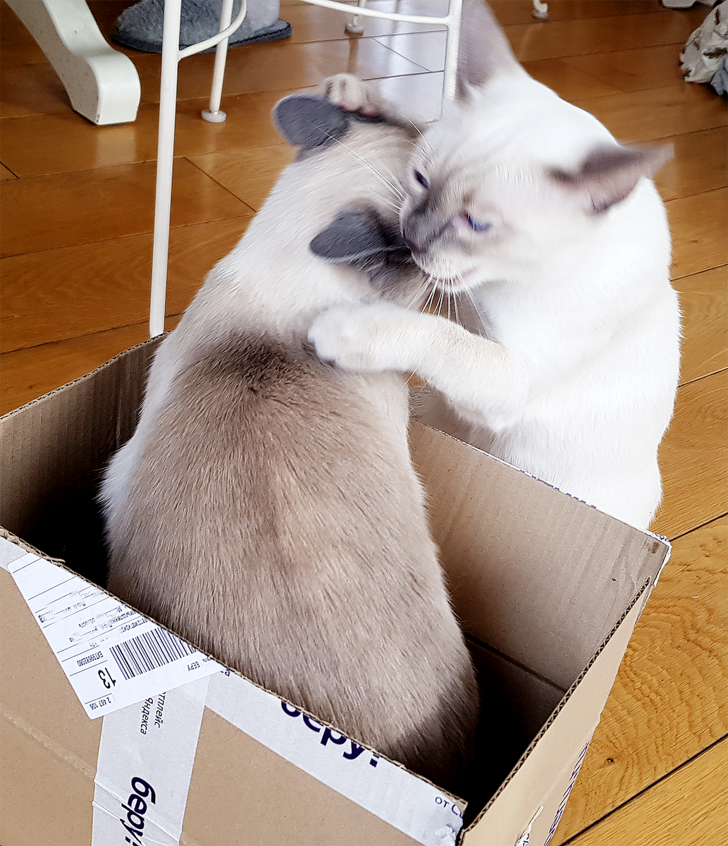 Перейду к следующим (6, 7 и 8), потому как у этих пушистых редисок, появляются еще немало новых забав и игр, отчего начинаем отчаянно мечтать о строительстве бункера... :))) Игра 6. "Тайские бои" На первый взгляд игра вполне себе понятная, два кота устраивают беззлобные потасовки, с различными элементами захватов, укладки на лопатки, укусов и пинков. Мы, конечно, посматриваем, чтоб они не сильно там увлекались, но пока вроде как все хорошо и мирно, по спортивному проходит. Но в этой игре есть один ОГРОООМНЫЙ минус: эти игры иногда происходят ночью или рано утром. И, если кто-то думает, что пушистый мягкий котик, роняемый другим мягким пушистым котиком на пол - это тихо, НИЧЕГО ПОДОБНОГО!!! Стоит просто жуткий грохот и стук. Лежишь, и сквозь сон отсчитываешь: "Бабахнуло. Громко. Митя Степу уронил. Еще раз, чуть потише, ага, это Степа
