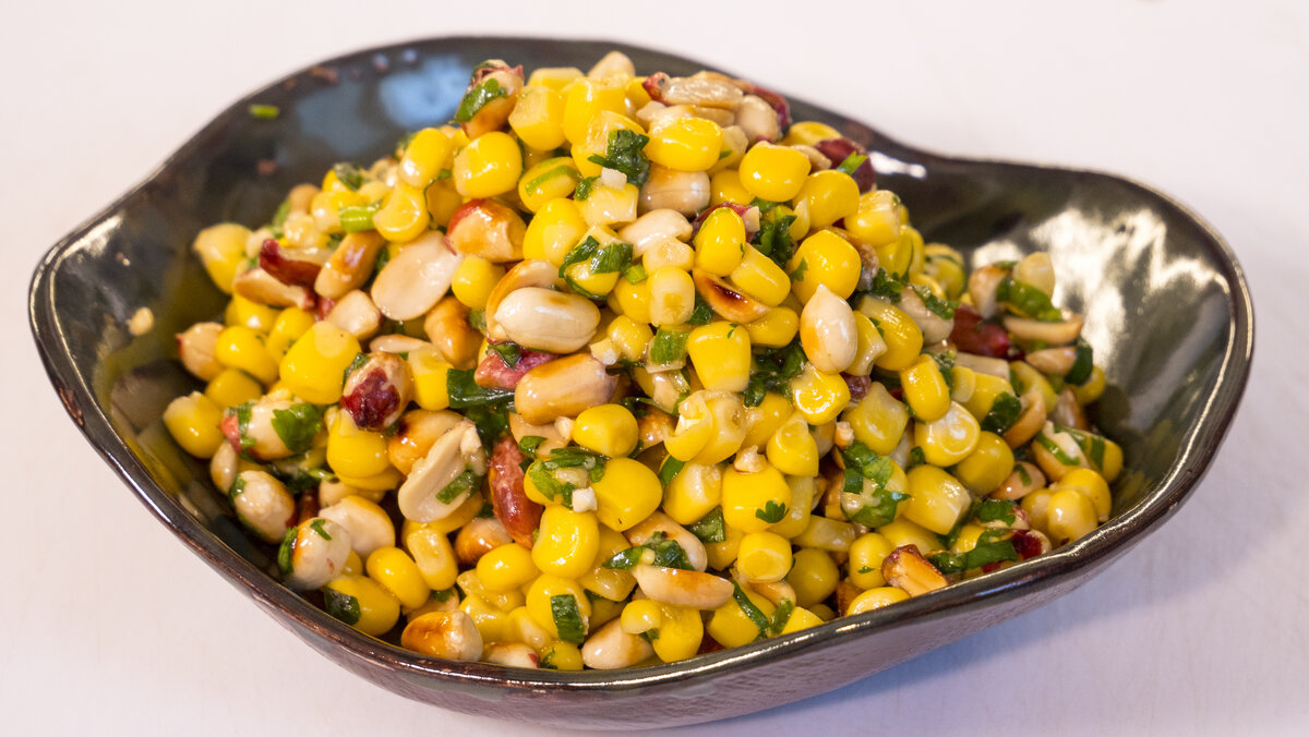 Почистите обжаренный арахис и все смешайте с кукурузой.