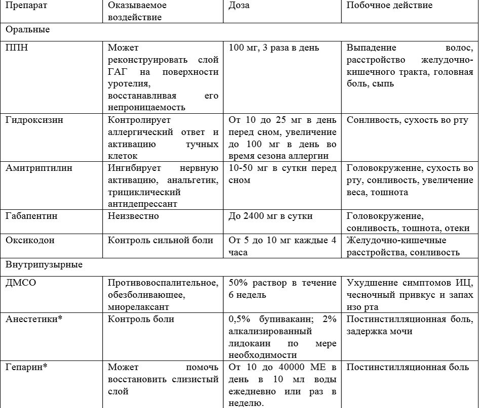 Существует несколько фармакологических вариантов лечения интерстициального цистита (см. таблицу ниже).