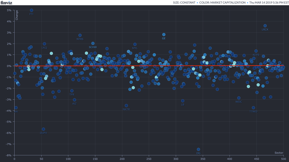 Главный фондовый индекс планеты пятый раз за последние полгода добрался до уровня 2800 и замер в нерешительности. Что дальше? Картина складывается интересная. Это S&P 500 в разрезе. Каждый кружок - входящая в индекс компания, цвет - капитализация (чем светлее - тем она больше), ось Х - изменение котировок в % за вчерашний торговый день (красная линия проходит через уровень 0). Правда, напоминает веточку под весенним солнцем, когда лед еще обволакивает ее, но внизу уже образуются сосульки, а отдельные капли уже оторвались и устремились к земле? Выше нулевой отметки наблюдается достаточно плотное скопление с ростом преимущественно до 1%, но половина компаний оказалась внизу, и динамика падения гораздо более выражена и вариативна. К слову, самая успешная компания вчера выросла на 4.98%, а самая неудачливая упала на 7.49%. Ситуация одинакова для корпораций всех масштабов и всех секторов (за исключением, пожалуй, финансового, что тоже не есть хорошо). И она (ситуация) пока складывается