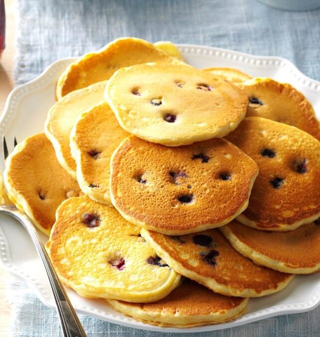 Время на приготовление: около 30 минут. Ингредиенты: 1 стакан пшеничной муки 2/3 чашки кукурузной муки 2 столовые ложки сахара 4 чайные ложки разрыхлителя 1 чайная ложка соли 2 больших яйца 1 стакан 2% молока 1/4 чашки оливкового масла Сироп для блинчиков Порядок действий: Объедините первые пять ингредиентов в одной миске. В другой миске взбейте яйца, молоко и масло, после чего перелейте в нашу первую чашу и перемешайте все сухие ингредиенты до увлажнения. Налейте приготовленное тесто в размере 1/4 стакана, на слегка смазанную маслом горячую сковороду. Переверните блинчик, когда пузырьки на поверхности начнут лопаться. Готовьте, пока вторая сторонка не станет золотисто-коричневой. Подавать к столу с сиропом. Клюквенно-апельсиновый вариант: перемешайте 3/4 стакана нарезанной свежей клюквы и 1 чайную ложку апельсиновой цедры в подготовленное тесто. Чернично-лимонный вариант: перемешайте 3/4 стакана свежей черники и 1 чайную ложку цедры лимона в подготовленное тесто. Маленькие советы