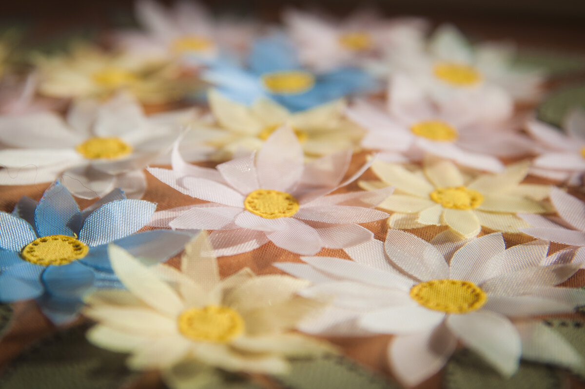 Представьте, как интересно такие цветочки могут смотреться, например, на детском платье. Вместе с ребенком можно сделать необычную картинку с ромашками или украсить сумочку, подхват для занавесок и т.д.
