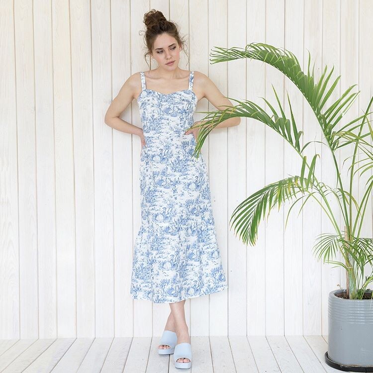 - сарафан на бретелях с ультрамодным в этом сезоне французскими принтом;