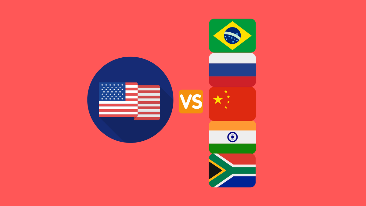 Посмотрев на соотношение сил, можно смело сказать США занимает доминирующее положение. Но ещё в начале прошлого века доминирующее положение занимала Великобритания со своими колония. Так какова вероятность что в скором времени какая-то страна или группа стран сможет сместить США с вершины мирового олимпа. Итак, сегодня мы сравним США с группой стран БРИКС. БРИКС это группа стран: Бразилия, Россия, Китай, Индия, Южная Африка, которые тесно сотрудничают с 2008 года. Сокращением было просто БРИК до вступления Южной Африки в 2010 году. Брикс является мощным конгломератом, населения которого составляет 43% от всего населения Земли. Общее население составляет около 3.6 млрд человек, думаю не стоит говорить в каких странах проживет большинство. Тогда как население США составляет всего 325 млн человек. ВВП США составляет 18 трлн долларов, и является самым большим ВВП в мире. Однако суммарное ВВП стран БРИКС превышает ВВП США и составляет 37 трлн долларов. По прогнозам экспертов к 2027 году В