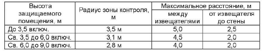 Точечные тепловые пожарные извещатели следует размещать в соответствии с таблицей 1.