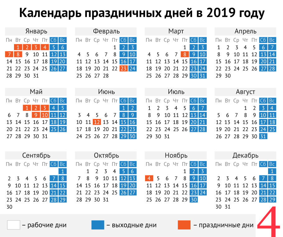 4 ноября — День народного единства. Скачать производственный календарь При чем не имеет значение - работаете Вы в коммерческой организации или на государственной службе. Закон распространяется на всех! Производственный календарь поможет безошибочно и быстро рассчитать заработную плату, оплатить больничный лист, оформить отпуск и составить график рабочей смены. ВАЖНО. Опираясь на утвержденный календарь 2019 года, Вы сможете выбрать наиболее благо
