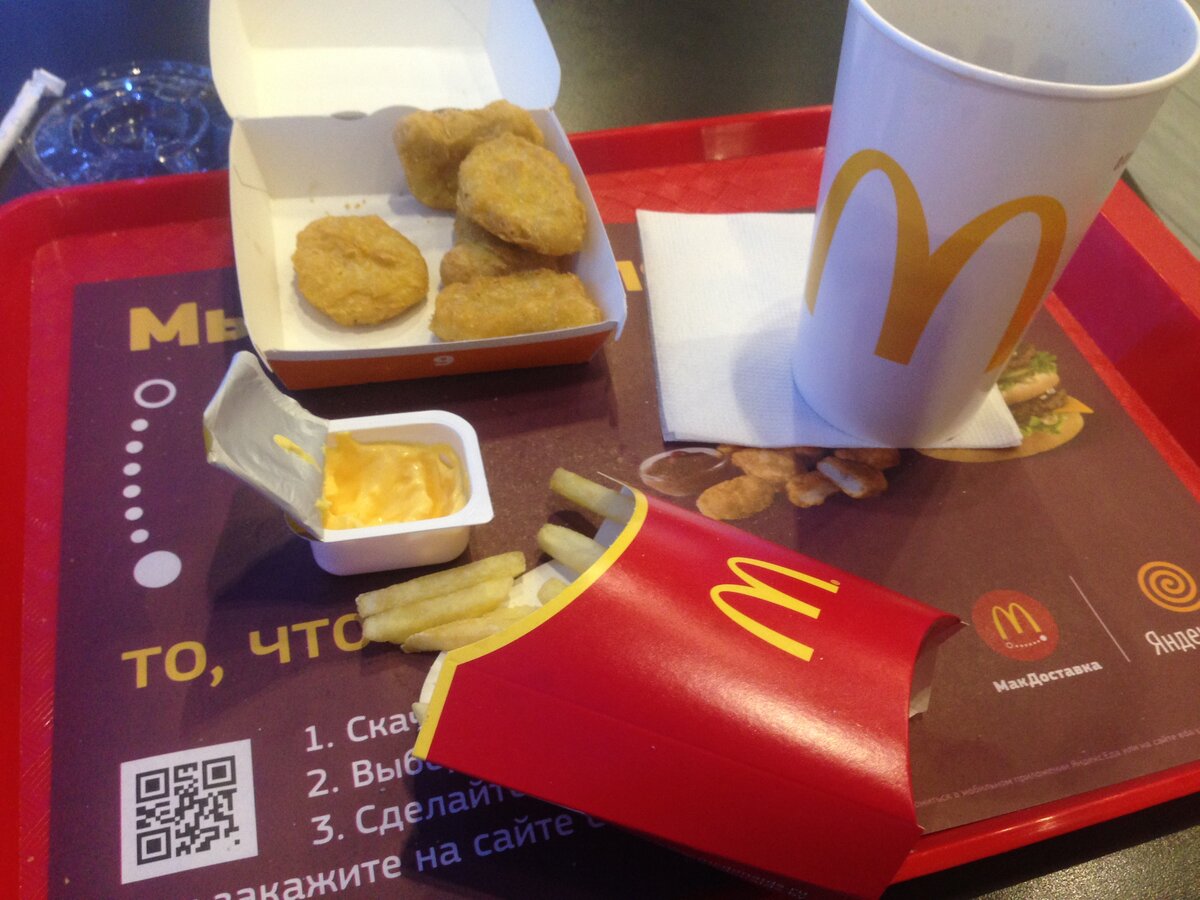 Если разбить съеденное на белки, жиры и углеводы, то картошка получится жирной и с высоким содержанием углеводов. А вот белка в ней мало. Наггетсы по идее должны содержать много белка, но это не так. Соотношение белков, жиров и углеводов в них практически одинаковое (2,9 г на однин наггетс). Кола это сплошные углеводы (сахар). А соус сплошной жир и немного углеводов. Итак мы скушали все это и через час пойдем на тренировку.