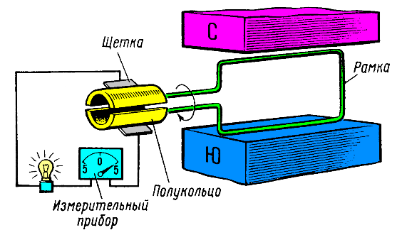 Эти кольца получили название контактных колец. Отведение электрического тока с контактных колец во внешнюю цепь (к лампочке) осуществляется упругими пластинками 3 и 4, прилегающими к кольцам. Эти пластинки называются щетками.
