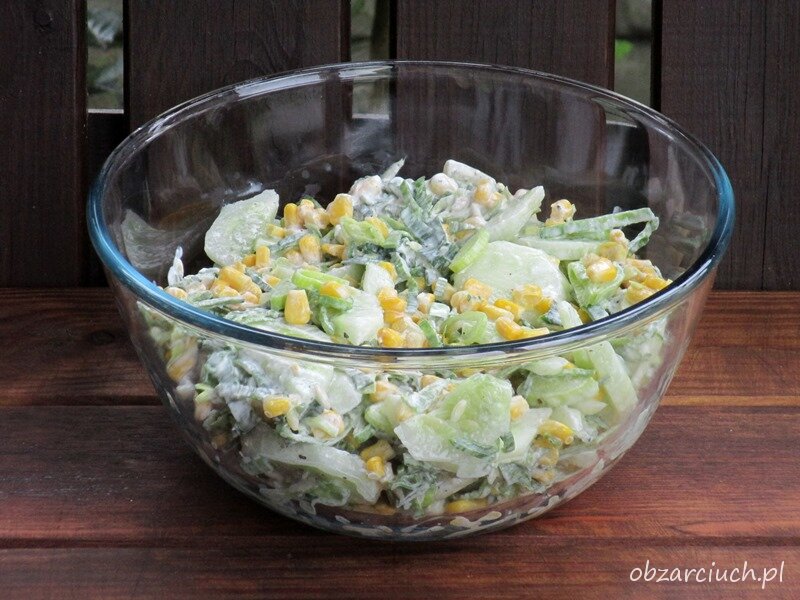 Лук-порей нарезать ломтиками, а очищенный огурец - на половинки. Распределите кукурузу от маринада. Добавить 2 столовые ложки майонеза и перемешать. Приятного аппетита!